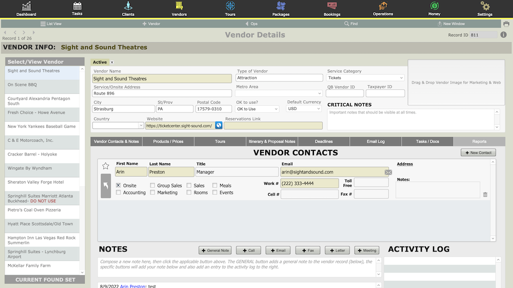 Once you click SUBMIT, your new Vendor record with the contact you just created will come into view. Click on the STAR icon next to the Vendor contact you just created to designate it at the “Primary” contact – like is done in the Client Module. The star icon will turn yellow, indicating this person has been designated as the Primary contact (this will add their contact info to the Vendor record in the Vendor list view.