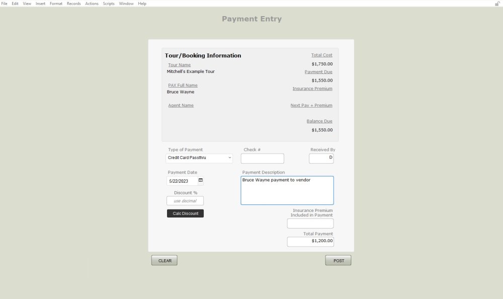 To finish the record and update the accounts payable record to reflect the payment as received by the vendor, navigate to the Operations module and find the appropriate vendor. Once within the associated record for the tour, find the “New Payment” button under the Account Payable tab. Enter the amount paid by the traveler to update the record, making sure to include a description for future reference.