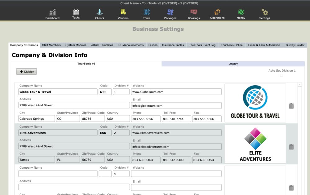 Divisions can be thought of as different brands under which you sell tours. A division has a unique name, logo, and often contact details (address, phone, email, website) and these items are stamped on documents (invoices, itineraries, proposals, etc.) for tours associated with a particular division. Check the “Auto Set Division 1” checkbox if you only have 1 division or if most of your Tours will be assigned to Division 1. This eliminates the need to remember to set it every time you create a new Tour.
