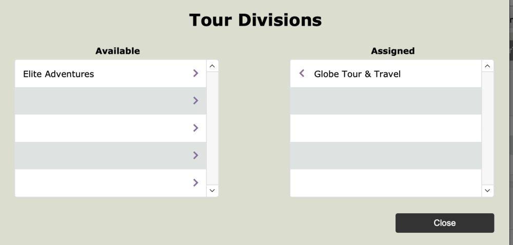 If the Division has not been set automatically, click the “Assign Divisions” button and then click the right arrow beside the Division (in the left column) that you want to assign to to the Tour (it will move to the right column). To unassign a division, reverse that process.