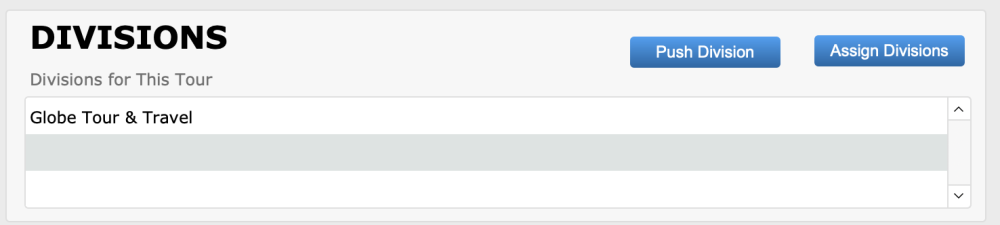 In most cases, a tour is associated with only 1 division. Multiple divisions can be assigned to a tour, if needed. In this case, some customization may be required to your booking documents if you want branding for both divisions to be shown.
