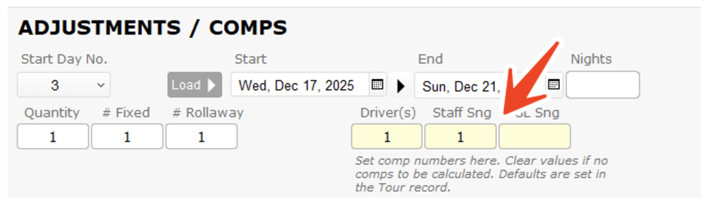 So, say your single room cost is $250, and you pull it into the itinerary for one night, indicating you need to provide two comps. The total Net cost for the Package to be sold to the paying participants will include the basic $250, but will also include $10 per passenger to cover the $500 additional cost, prorated over 50.