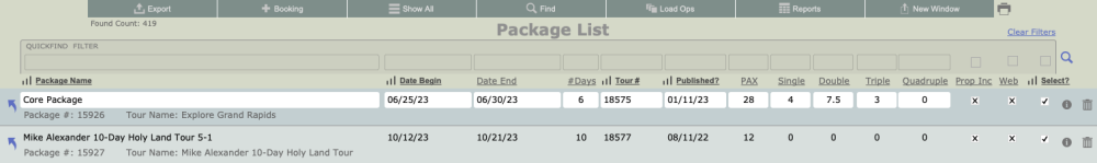 Generally, when you navigate to the Packages Module, you will be in a found set of Packages specific to a Tour, having navigated from the Tour using the Go to Related Packages button.