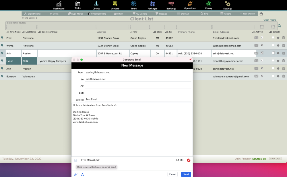 To send a single email to a Client or Vendor contact, click on the envelope icon to the right of that contact’s email address. An email message window will appear and your email signature will be added to the body of the email. Add any email addresses you’d like to CC or BCC, enter a subject line, add content to the body of the email, and attach any documents or images (up to 10MB). If you’d like to save the attachments to the email log for that Client or Vendor, to be able to open/review them at a later date, click on the DISK ICON (just to the left of your attachment) and it will turn dark, indicating that it will be stored in the Client/Vendor record. Click the CANCEL button to cancel sending of the email; click the SEND button when you are ready to send it.