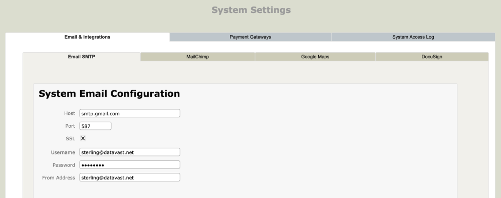 The SMTP email account settings are accessible to your management and IT staff on the Email SMTP tab. In previous versions, clients had to open a support ticket to update their SMTP passwords when they changed; in v5, you can make changes to these settings without our assistance.