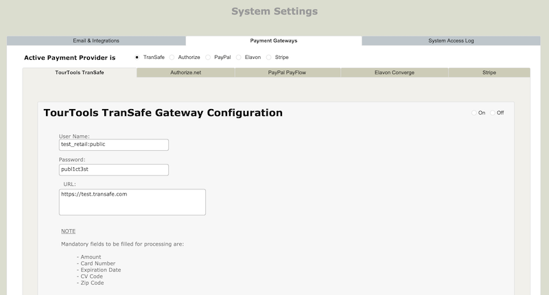 This is where your payment gateway configuration is managed. In previous versions, clients had to open a support ticket to update these details; in v5, you can make changes to these settings without our assistance if you have IT staff or consultants. By default, TourTools supports the following gateways: TourTools/TranSafe, Authorize.net, Elavon Converge, PayPal Payflow Pro, and Stripe.