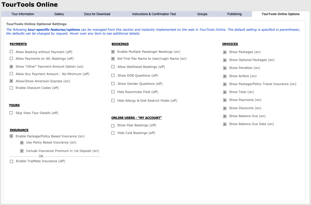 This tab allows tour-specific features/options to be managed and instantly implemented on the web in TourTools Online. The default setting is specified in parentheses; the defaults can be changed by request. Hover over any item to see additional details (also spelled out below)