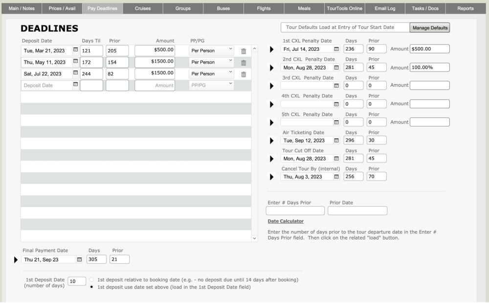 The Tours module contains a Pay Deadlines tab, where you can manage the deposit dates, deposit amounts, cancellation penalty dates, and cancellation amounts. If the tour is published to TourTools Online, this information is pushed out to your website and displayed when a traveler or group leader books the tour. You have the ability to turn on/off the visibility of various items (e.g. penalties, deposit dates) using the TTO Options Tab above.