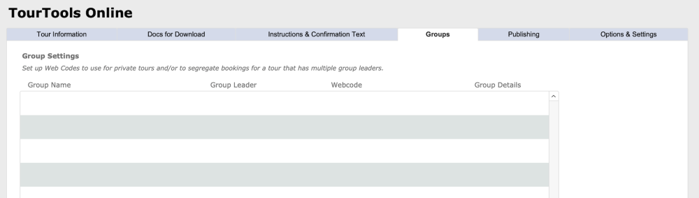 This tab allows you to set up Web Codes to use for private tours and/or to segregate bookings for a tour that has multiple group leaders.