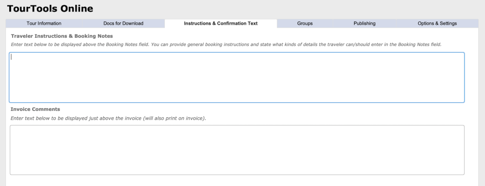 This tab allows you to control the verbiage that displays above the Booking Notes section during the booking process; add details about what kind of information you want them to provide in this field. You can also add specific text you’d like to be inserted at the top of the invoice and in the booking confirmation email.