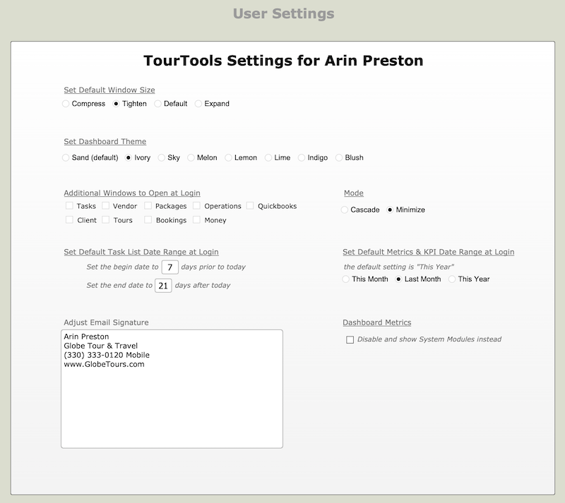 The USER SETTINGS are accessible to each TourTools user. These settings allow users to set preferences that impact their TourTools sessions only. Things like setting a color theme for their Dashboard, managing their email signature, setting a default window size, and more.